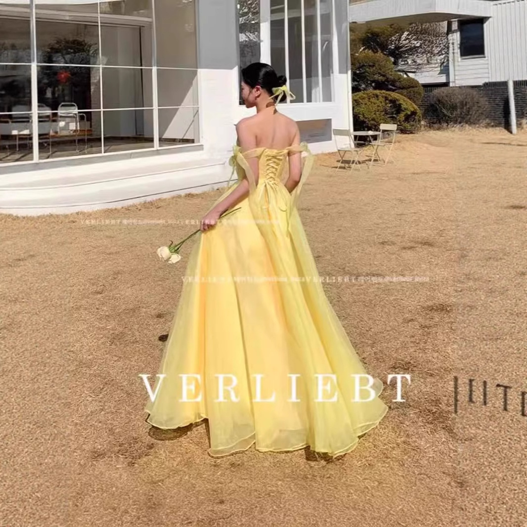 Gaun Malam Gaya Korea Pakaian Studio Backless Kuning Model Baru 2025 Gaun Fotografi Sehari-hari Tanpa Lengan Dapat Dipakai