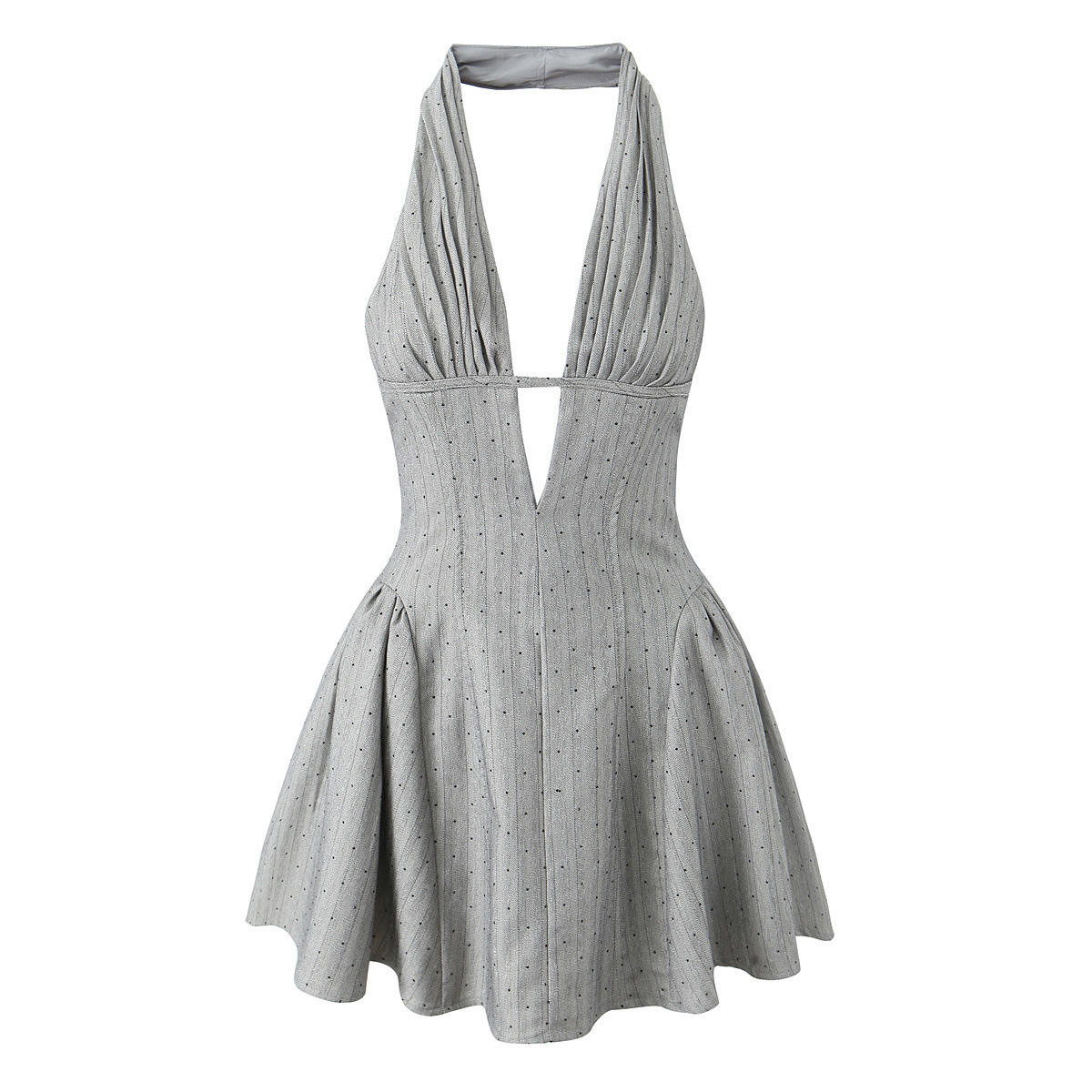 Gaun Gantung Leher Berlian Panas Wanita Elegan Gaun Membentuk Pinggang Berkerut Kerah V Dalam Gaya Premium Retro Prancis Rok Pendek