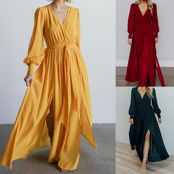 Gaun seksi kerah v panjang wanita, baju belah tidak rata panjang warna polos leher V tali baru Eropa dan Amerika lintas batas