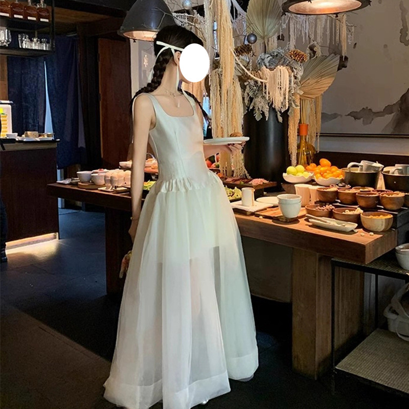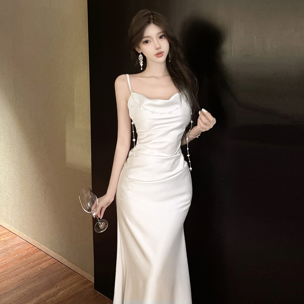 Rok Panjang Elegan Niche Gaya Murni Model Baru Rok Tank-top Tali Kasa Satin Gaun Gaun Wanita Rok Putih