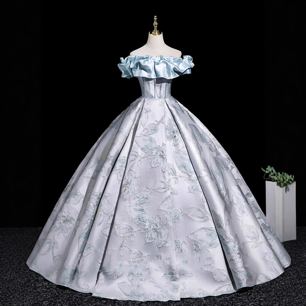 Gaun malam warna biru peri untuk ujian pertunjukan vokal, gaun off-shoulder untuk siswa musik, rok mengembang untuk upacara remaja, gaun pembawa acara, gaun pengantin.