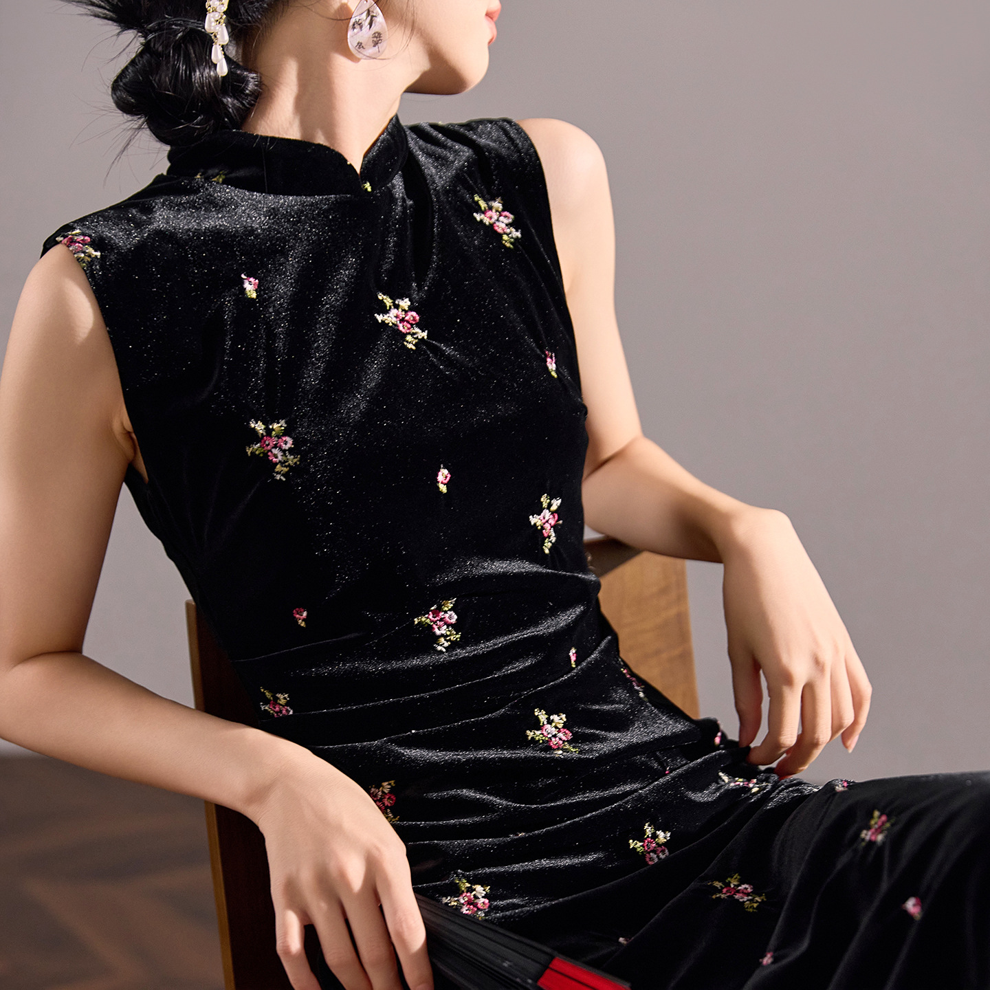 Gaun cheongsam tanpa lengan gaya Cina baru 2025 musim gugur dengan desain bergaya nasional, potongan ramping kerah berdiri M1525