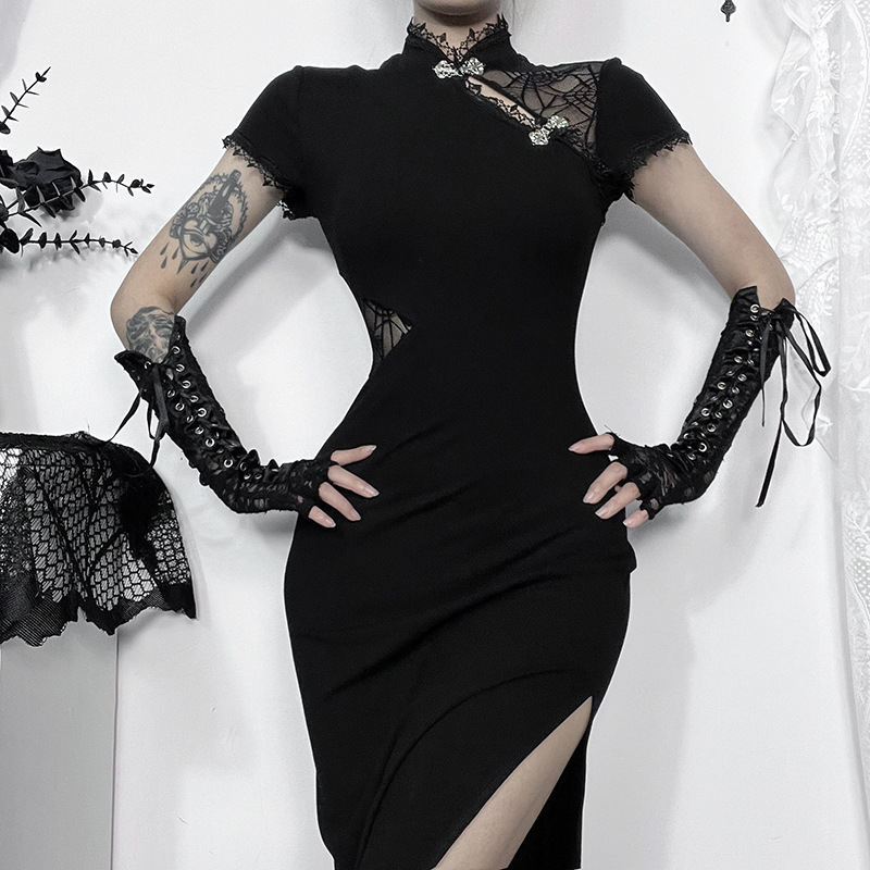 XS24123 Rok Split Model Baru 2024 Musim Panas Gaun Cheongsam Kombinasi Membentuk Tubuh Seksi Elegan Gaya Hitam Gelap Wanita