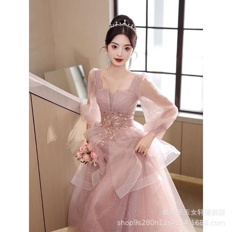 Gaun malam merah muda 2024 baru jamuan makan pertunangan elegan cahaya mewah niche high-end lengan panjang tuan rumah
