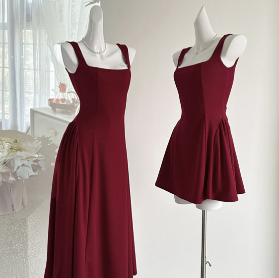 Gaun Suspender Merah Satu Prancis Rok Merah Kecil Hepburn Model Panjang Gaun Pertunangan Kecil Cantik Berkelas Tinggi Musim Dingin