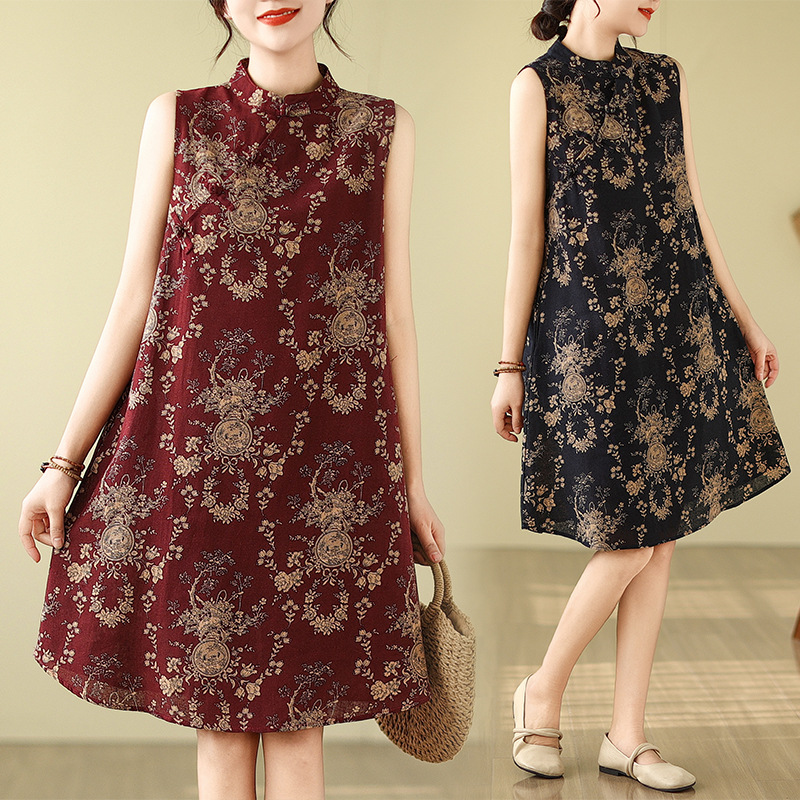 Cheongsam Modifikasi Kerah Tegak Gaya Tiongkok Bercorak Katun Linen High-end Pakaian Musim Panas Wanita Gaun Tank-top Lengan Pendek Mengurangi Usia Santai Longgar
