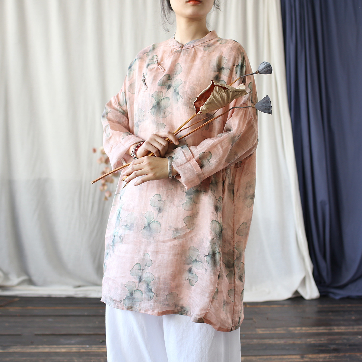 Floating delapan catatan "daun mati dan pipa" baru gaya nasional Cina penuh rami tencel gesper dicelup gaun cheongsam