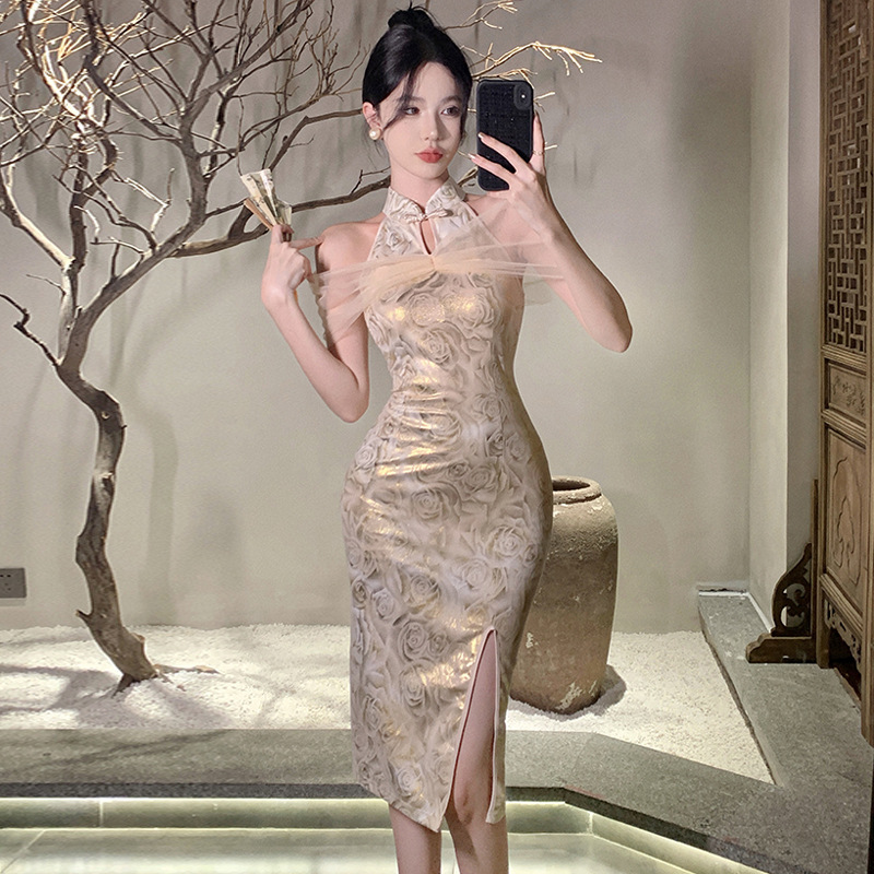 Cheongsam Modifikasi Gaya Tiongkok Baru Gaun Gantung Leher Musim Semi Wanita Pure Elegan Seksi Rok Pinggul Ketat Gadis Hot