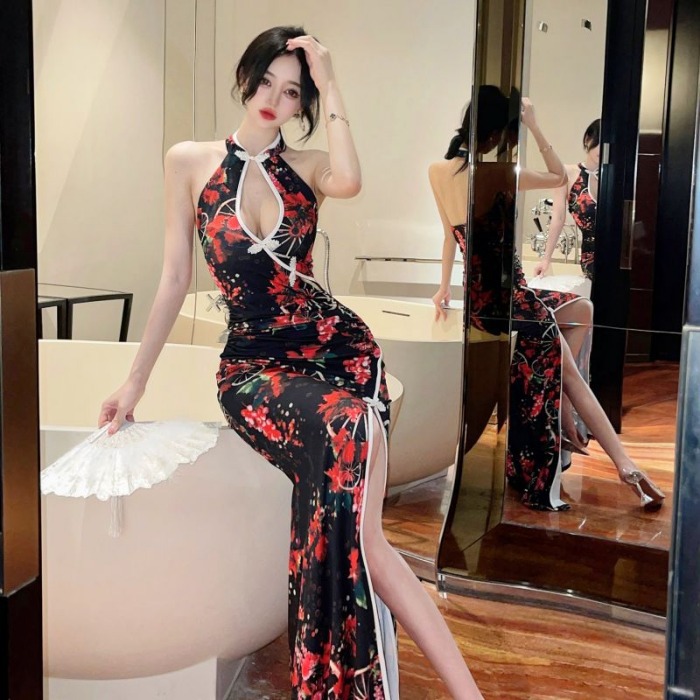 Gaun panjang seksi berlubang, halter cheongsam pelangsing pinggang tinggi retro bermotif musim panas baru 2022