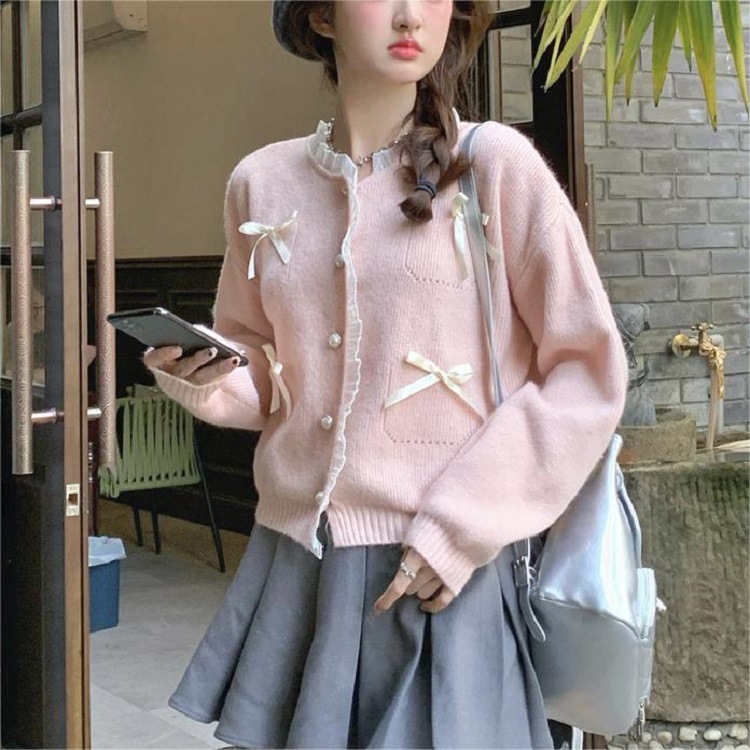 浪漫蝴蝶结针织开衫女喇叭袖圆领毛衣小外套短款上衣韩系甜美风