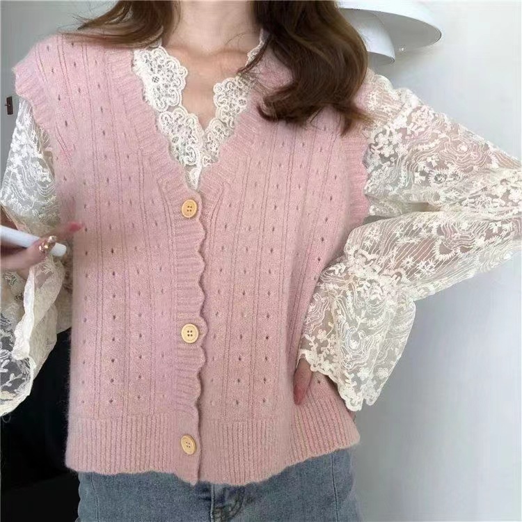 Rompi rajut wanita, pakaian luar sweater kasual warna solid renda wanita musim semi dan gugur 2024 baru
