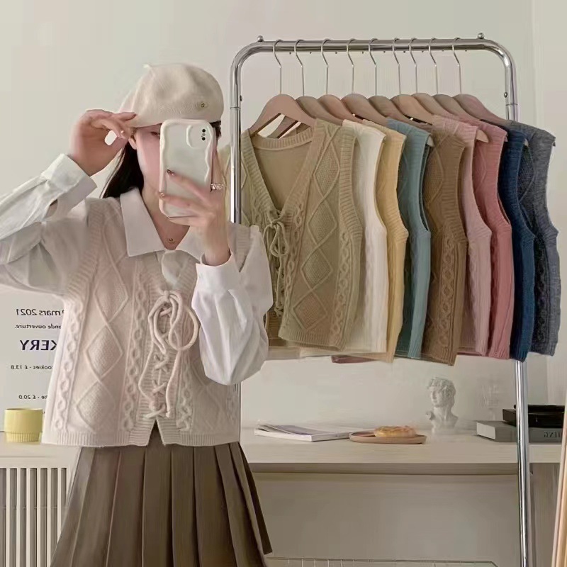 Rompi bergelombang tidak beraturan musim semi dan musim gugur gaya Jepang dan Korea warna solid manis leher-v rompi rajut berlubang mantel wanita ins tumpuk
