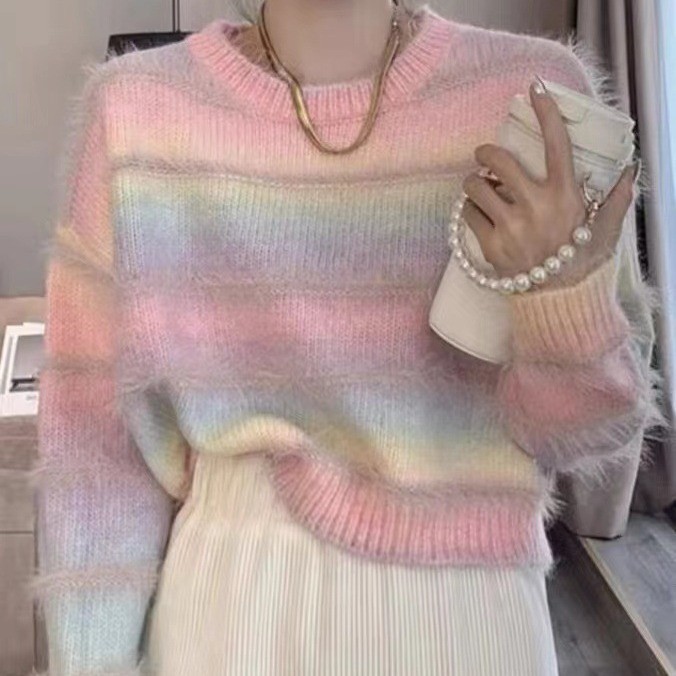 秋冬新款条纹毛毛拼接针织毛衣女甜美针织衫时尚长袖上衣