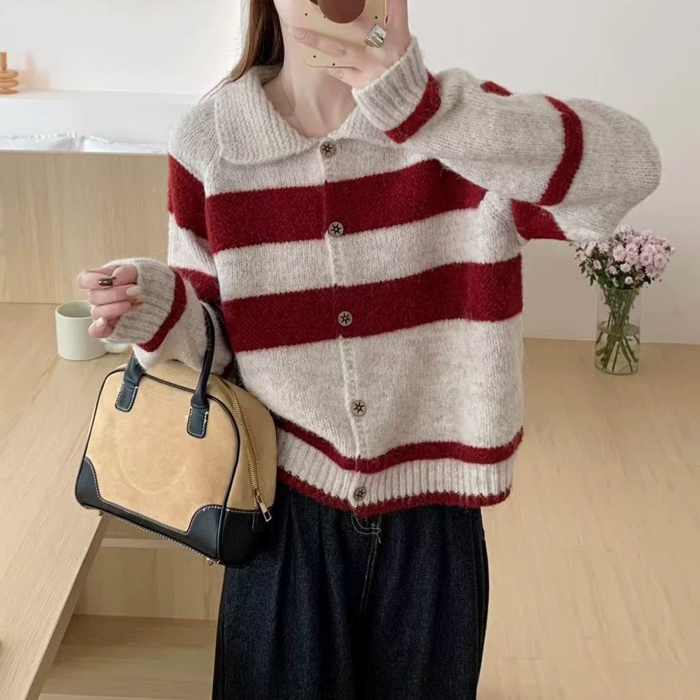 Mantel Kardigan Rajutan Kerah Terbalik Gaya Malas Bergaris Warna Kontras Sweater Wanita Model Baru Musim Gugur Musim Dingin dan Musim Dingin Mudah Dipadu Padan Gaya Korea