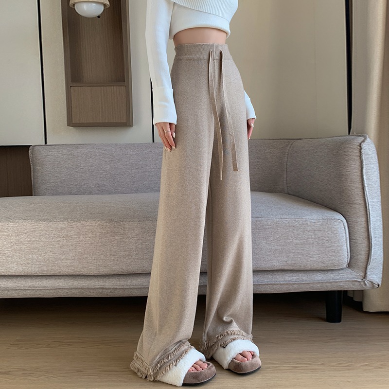 针织流苏阔腿裤女秋冬季小个子毛边拖地长裤松紧腰抽绳直筒休闲裤