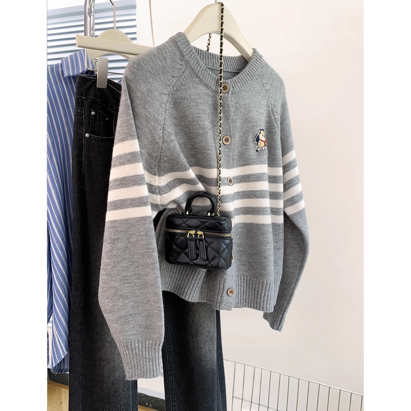 Jaket Sweater Bergaris Bordir Warna Abu-abu Atasan Kardigan Rajutan Model Pendek Gaya Kampus Model Baru 2025 Musim Semi dan Musim Gugur Wanita