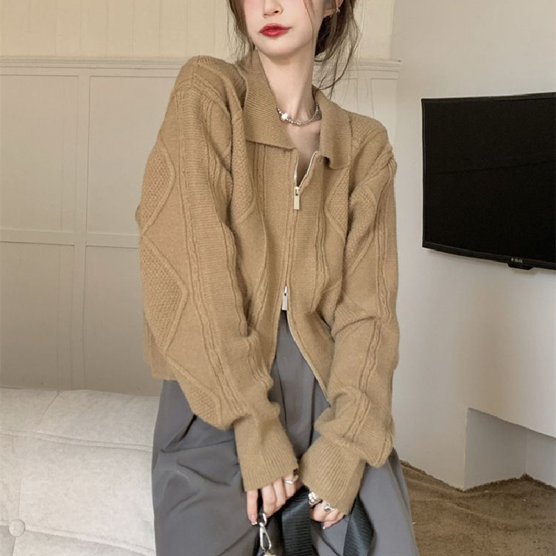 Sweater Rajut Ritsleting Ganda Kerah Twist Kardigan Jaket Wanita Atasan Rajutan Malas Longgar Gaya Barat Wanita