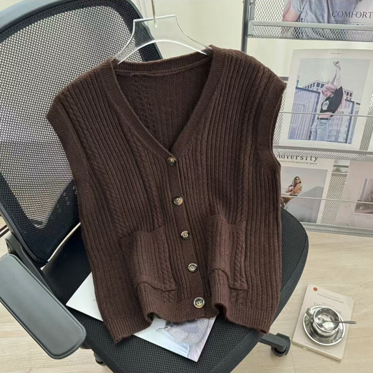 韩版V领口袋纯色针织马甲女装 秋冬新款外搭叠穿坎肩毛衣背心女潮