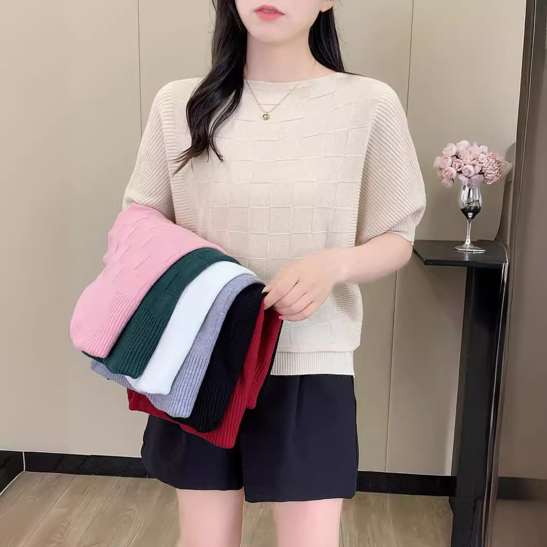 Sweter lengan sayap kelelawar gaya Korea, atasan tipis versi kasual lengan pendek 2024
