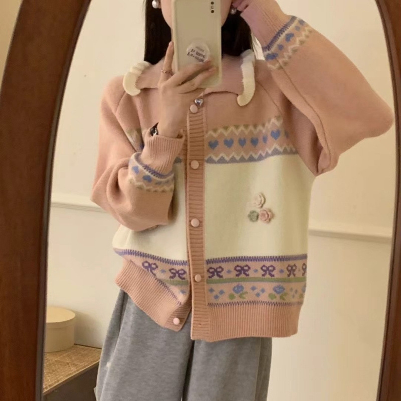 Mantel Kardigan Sweater Rajut Warna Kontras Bunga Tiga Dimensi Pola Jacquard Desain Gentle Retro Musim Gugur Musim Dingin