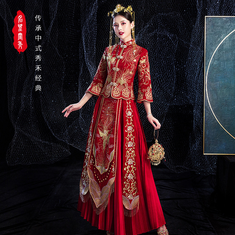 Gaun pengantin bersulang, Gaun kecil wanita hamil Tiongkok Musim Semi dan Gugur, Gaun Xiuhe pernikahan merah anggur