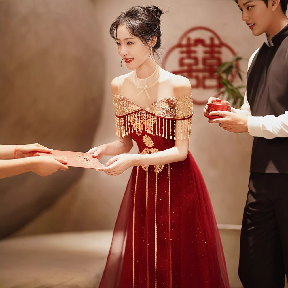 Gaun Toast pengantin wanita, perlengkapan pernikahan kembali ke pintu China Xiuhe anggur merah musim semi baru 2024