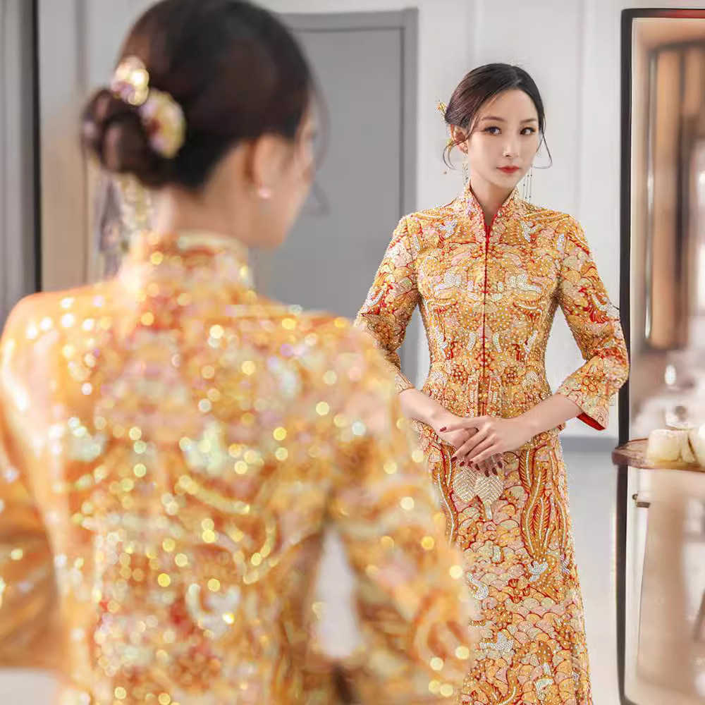 Gaun pengantin wanita, gaun pengantin emas naga dan phoenix 2023, gaun pernikahan Cina baru musim panas ramping Xiuhe