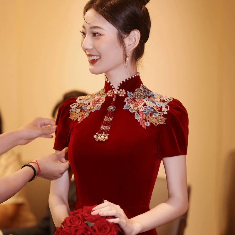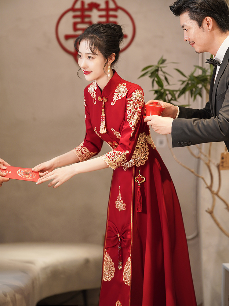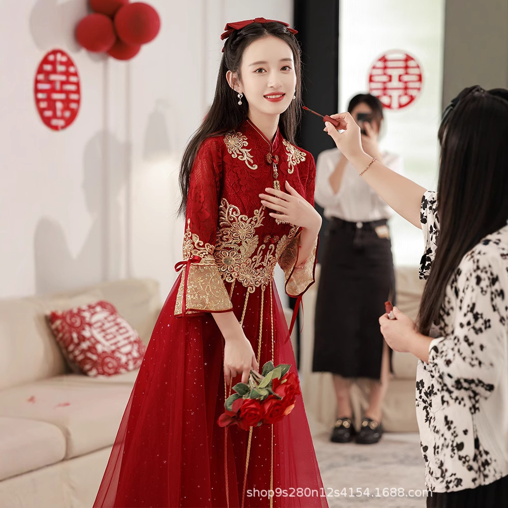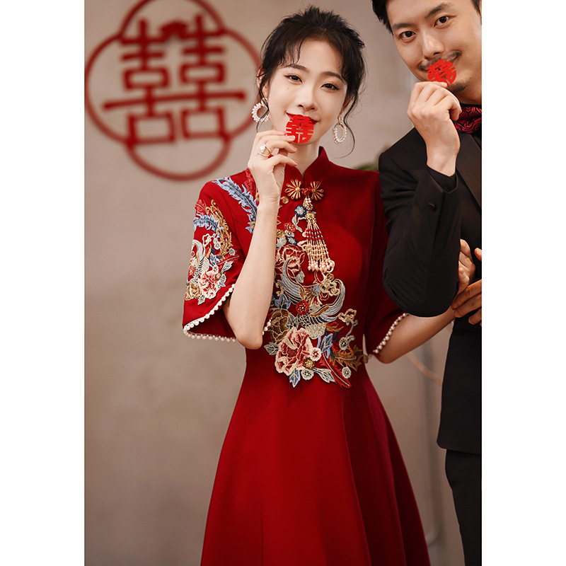 Gaun pengantin bersulang, cheongsam gaya Tiongkok kembali ke pintu wanita hamil elegan anggur merah pernikahan Xiuhe gaun pertunangan musim panas