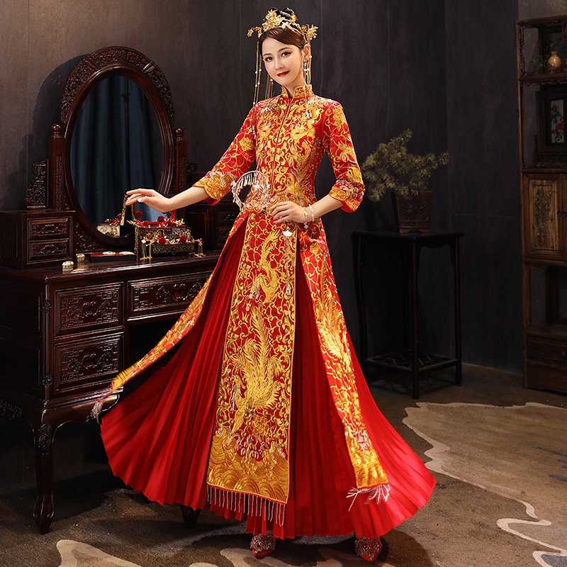 Gaun pengantin Xiuhe 2023, gaun pengantin bergaya Cina, mahkota dan jubah phoenix, gaun naga dan phoenix, gaya retro musim panas untuk wanita, cheongsam