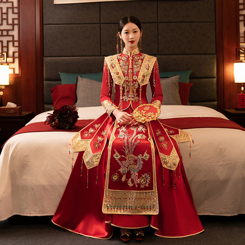 Pakaian Xiuhe Pakaian Pernikahan Gaya Tiongkok Pengantin Wanita Model Baru 2024 Pakaian Bersulang Pertunjukan Pakaian Kimono Musim Dingin Pekerja Berat Mewah Pria Kecil