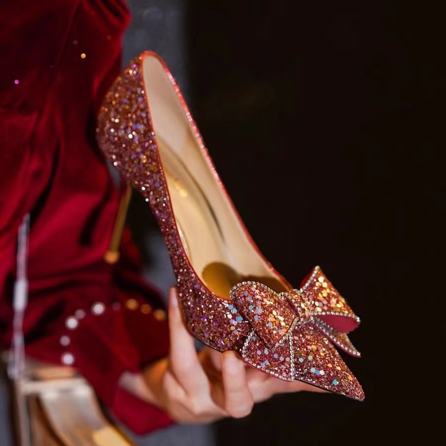 Sepatu hak tinggi merah untuk wanita 2023 sepatu pernikahan pengantin hak stiletto ujung lancip baru berpayet pita Xiuhe