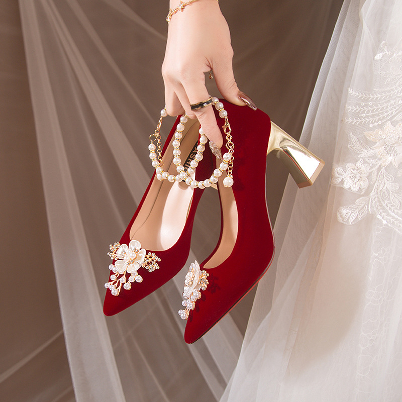 Sepatu pengantin wanita hak tinggi warna merah 2026, sepatu pengantin berhias manik-manik dengan tali, gaya putri untuk acara bersulang, dapat dipakai dua cara.