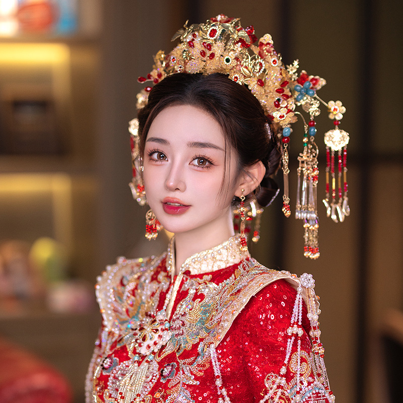Aksesoris rambut Xiuhe merah setelan jas pengantin baru Cina cheongsam naga dan phoenix gaun hiasan kepala mengurangi usia manis meriah elegan