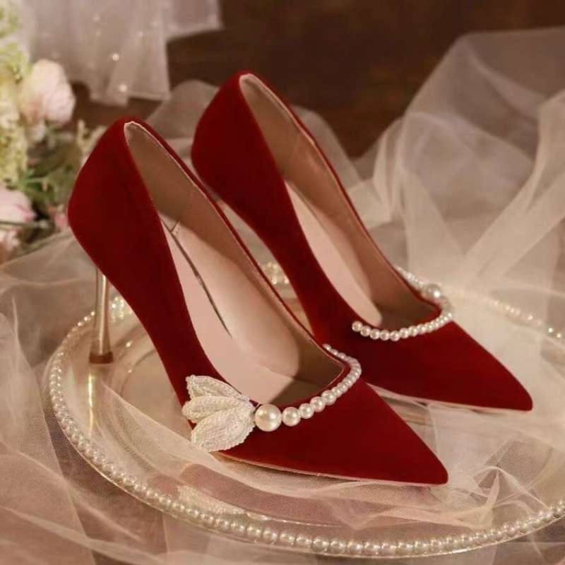 Sepatu Pernikahan Warna Merah Sepatu Pengantin Mutiara Pakaian Xiuhe Gaya Tiongkok Model Baru Tahun 2025 Wanita Sepatu Hak Tinggi Rasa Kelas Tinggi Niche