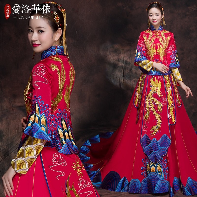 Pakaian pernikahan tradisional Tiongkok gaun naga dan burung phoenix pertunangan musim panas