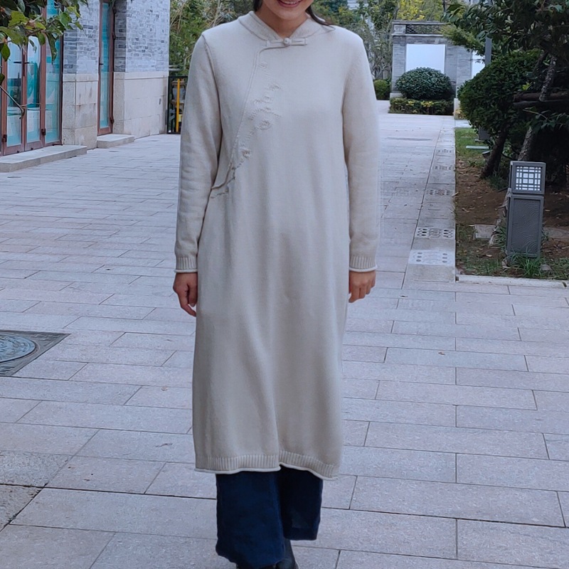 Gaun cheongsam rajutan lengan panjang katun, 4001 benang katun longgar bordir panjang sedang retro baju teh