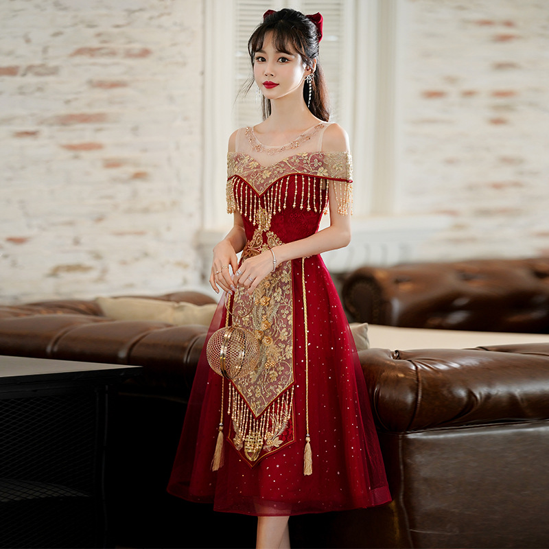 Gaun Qipao untuk pengantin wanita 2026 gaya baru warna burgundy, gaun Xiuhe Cina untuk acara homecoming, gaun pengantin untuk wanita bertubuh mungil.