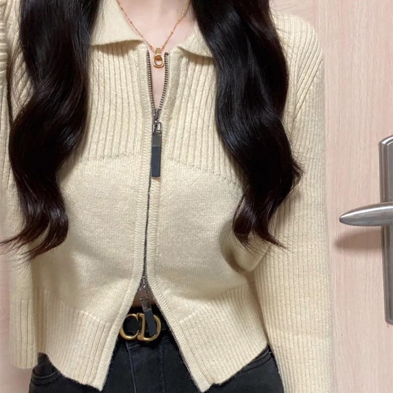 Jaket Sweater Ritsleting Ganda Kerah Polo Atasan Kardigan Rajutan Dasar Model Pendek Gaya Desain Baru Musim Semi dan Musim Gugur Wanita