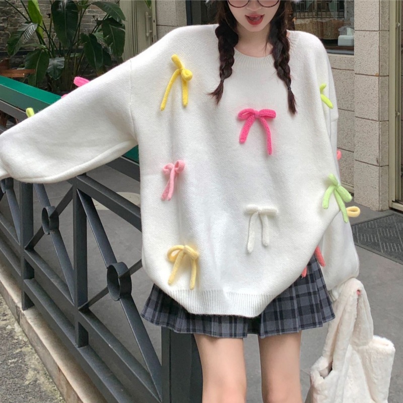 Atasan Rajut Pita Kupu-Kupu Tiga Dimensi Warna Manis Gaya Santai Longgar Model Baru Musim Gugur Musim Dingin Versi Korea Sweater Wanita Pullover Mengurangi Usia