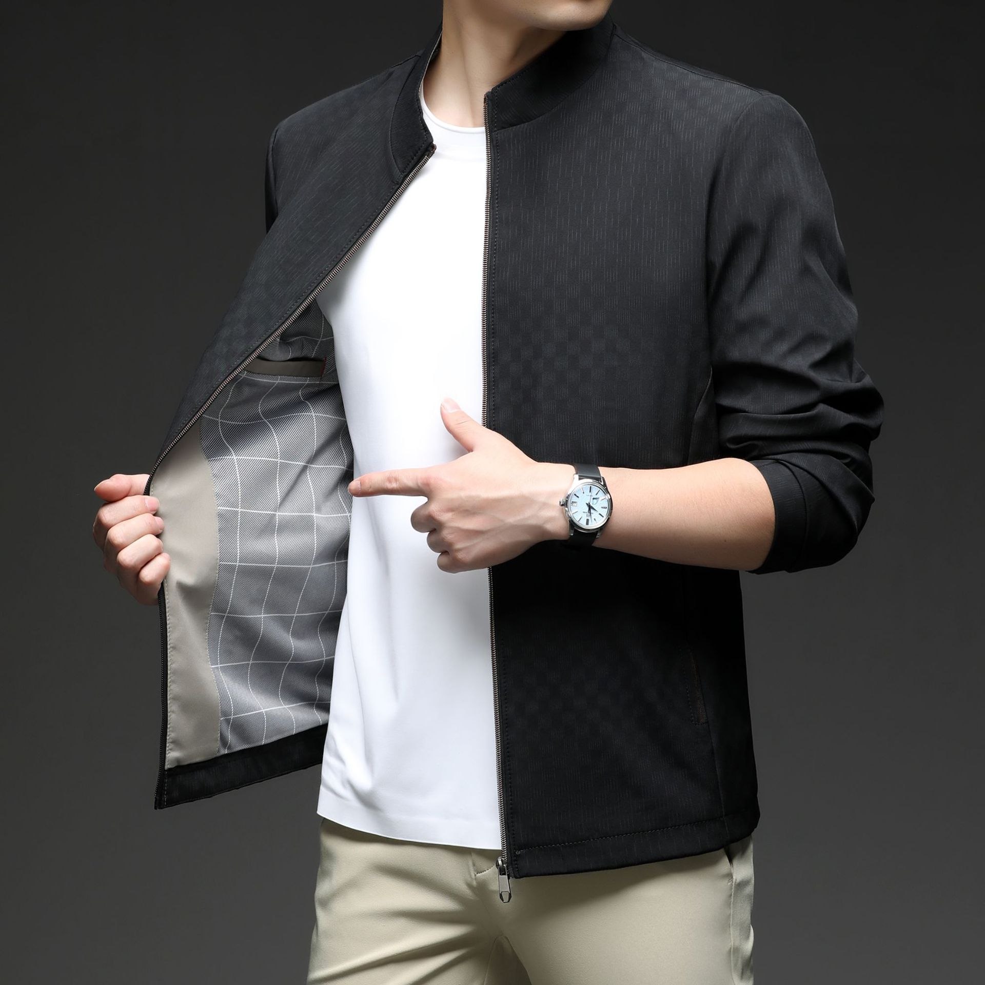 热销款秋季新款男装外套中年爸爸立领拉链开衫暗纹花商务休闲夹克