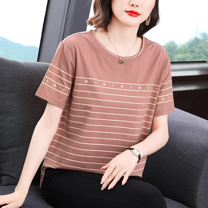 Kaus lengan pendek bergaris untuk ibu paruh baya dan lansia, kemeja pelangsing pengurang usia, pakaian atasan ukuran besar longgar musim panas