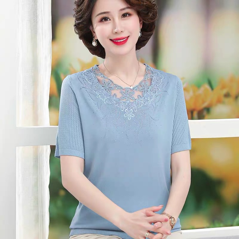 Kaus musim panas lengan pendek pengurang usia, pakaian ibu sutra es, usia menengah dan orang tua, Atasan Musim Panas 2023
