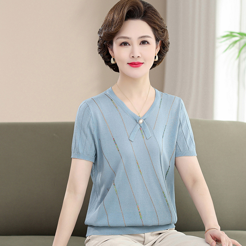 Kaus lengan pendek untuk wanita, kaos sutra es gaya Barat usia 40 tahun 50 usia sedang dan lansia, atasan rajut elegan kerah V baru musim panas