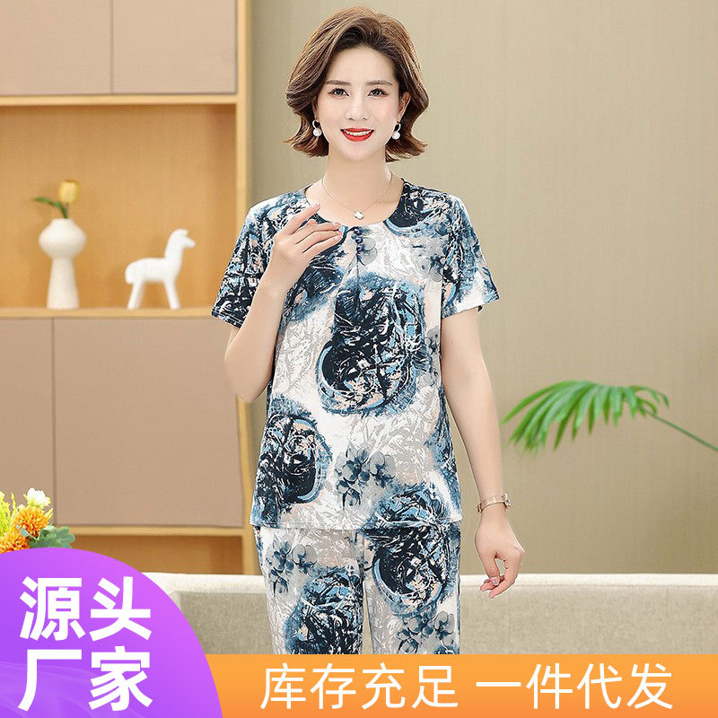 Baju musim panas ibu langsung pabrik pakaian wanita paruh baya dan lansia tipis sutra es pakaian nenek wanita tua setelan dua potong