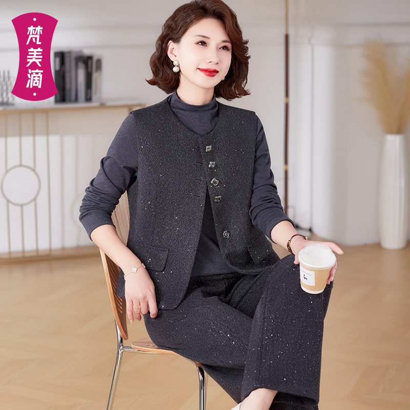 Pakaian Ibu Model Baru Musim Semi 2025 Setelan Santai Gaya Chanel Kecil Set Tiga Potong Rompi Atasan Celana Panjang Pakaian Wanita Setengah Baya dan Tua