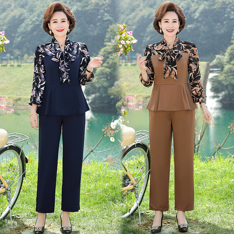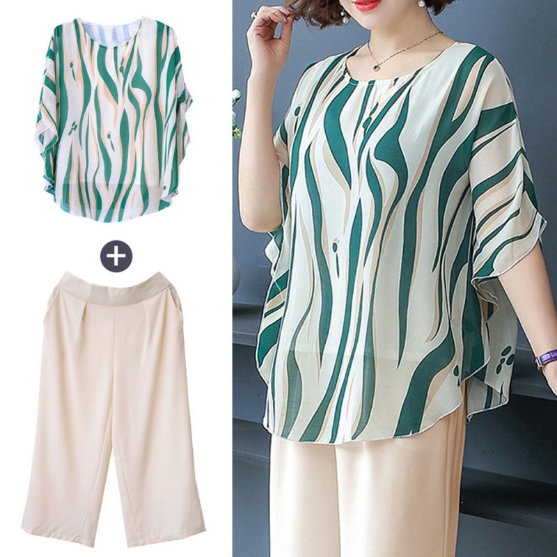 Set Dua Potong Pakaian Ibu Setengah Baya Musim Panas Kemeja Sifon Berusia 40-50 Tahun Baju Atasan Wanita Musim Panas Pakaian Wanita Gaya Barat Setelan 60