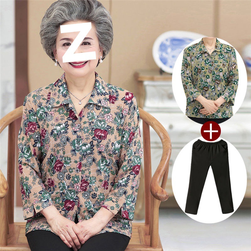 Kemeja Musim Semi Pakaian Nenek Setelan Atasan Ibu Wanita Setengah Baya/Pakaian Musim Panas Wanita Satu Potongan Pakaian Orang Tua