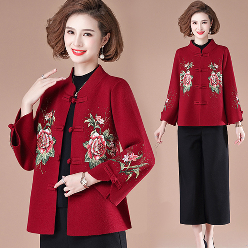 Mantel merah pernikahan musim gugur ibu bahagia kardigan rajut ibu mertua bahagia pakaian banquet Pernikahan musim gugur dan musim dingin wanita paruh baya dan lansia