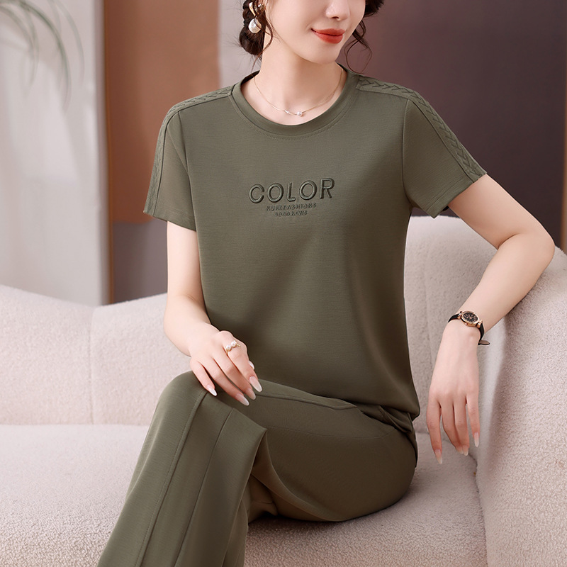 Set Pakaian Musim Panas Wanita Setengah Baya Merek 2025 Celana Panjang Lengan Pendek Wanita Modis Kerah Bulat Set Olahraga Kasual