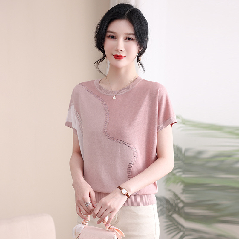 Kaus lengan pendek untuk ibu muda, kaos sutra es baru leher bulat, T-shirt usia sedang dan lansia elegan longgar tipis atasan rajut musim panas